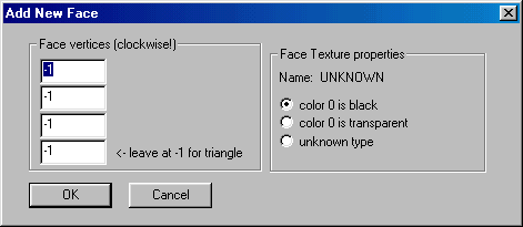 Note 2: the texture does not need to be the one you will finally end up using for your model.  It can be anything for the time being, and you can and most certainly will change it later.  The point, for now, is that faces need textures mapped to them, and binedit needs something, any texture, in order to create the face.   If you know the texture you will be using for this particular face, then by all means load it up.  If, on the other hand, you are not certain, then anything will suffice.  A favorite of mine is just a blank arrow that I made.