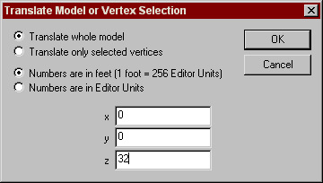 This is important! Open up the resize dialog and turn on Keep Proportions. Change the height to 2 feet, and click OK. In the Vertex menu, click Merge close vertices and click OK. Resize the model back to it's original size (4 feet high, 4 feet long, 256 feet long) and delete all unused vertices (Vertex menu). We resized for reasons I will explain later.