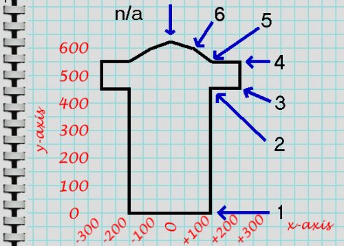 Note 1 - These numbers are proportionate numbers only and are based on your sketch.  As Bin-Masta informs us, "Tiremaker automatically resizes the dimensions by a factor of 10 and Bin-Edit automatically resizes all imported wavefronts by a factor of 1000."  This means that while it is theoretically possible to create a model that will import into BinEdit at exactly the size you require, it is probably far more practical to use proportionate numbers (as I have done here) and then resize using BinEdit.  You'll also notice that this model will not be centered along the y-axis.  But that is another thing that's easy to solve using BinEdit.