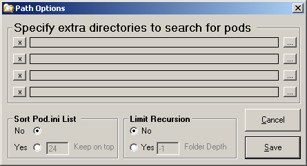 When you first run cowpod, it is set to read ALL sub folders. That is, don't limit anything. But if you click the "yes" button you can limit how far cowpod will look for pod files. Setting it to zero will restrict the pod file search to the current directory (and the root of user paths). Setting it to one, two, or three, etc. will indicate to look that many sub folders beyond the currect one but to look no further after that. The limit is set for the program folder and for user paths too. The bottom line, however, is that you have complete flexibility and control over what you do.
