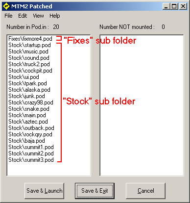 In the "fixes" folder, I will put fixmore4.pod, a drivercheckin.pod, dustsmoke.pod and any extras that I might use to customize the game. In the "stock" folder, I move all the stock pods. All of them. I don't have any pods in the mtm2 game folder.
