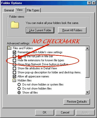 (Folder Options) Get to windows folder options by clicking View>Folder Options on the windows explorer menu. ![]() Click the View tab. ![]() Now uncheck the option "Hide file extensions for known file types" ![]() Click OK and you should now see the file extensions for all files. |