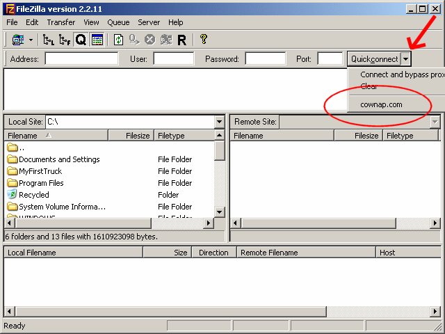 Click the quick connect button and you will see "cownap.com" in the drop down menu. Click it.