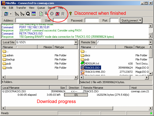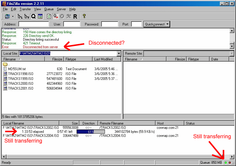 2. FileZilla says it disconnected from server but is still downloading the file. Will this mess up my download? What's going on?