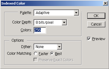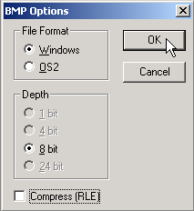 First, you have to make sure all layers are merged into one. Then reduce the color as shown here. ![]() You will be prompted for indexed color settings. ![]() Now save as... ![]() Give it a name and save as bmp. (click the image to see the psp eqivalent screen - notice the options button on the save dialog box). ![]() In photoshop, you're prompted for save options when you save. (click the image to see the psp screen - you get that when you click the options button) ![]() Conversion is successful in both programs. ![]() |