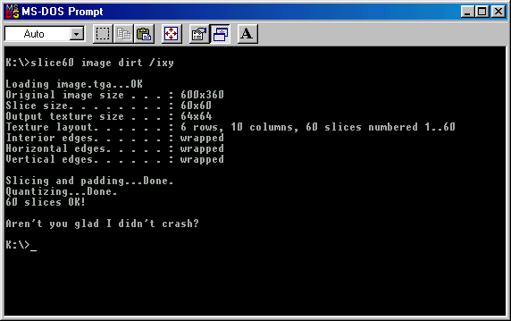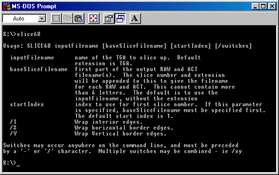 Sample command linesC:\>slice60 image dirt 065 /ixy In this case, slice60 will read the tga file named "image" and create a set of sliced textures with the base name "dirt". The file counter will begin at 65 so the first file names will be "dirt065.raw" and "dirt065.act". Finally, this will process the two pixel overlap for the inside edges as well as the horizontal and vertical outer edges. C:\>slice60 image dirt /ixy Same as above but the counter will begin at 1. Example: "dirt001.raw" and "dirt001.act". C:\>slice60 dirt In this case, slice60 will read the tga file named "dirt" and create a set of sliced textures with the base name "dirt". The file counter will begin at 1 and will NOT process the two pixel overlap on any edges. When the program has finished running, the screen will always look something like: this. For more notes on the Switch options, please see here. Some facts- 24 bit tga at 60 pixel increments - All output files will be 64x64 pixels - baseSliceFilename must be unique - Five letter target name (not six) - Input and base file names cannot exceed 8 characters in total, including the 3 digit counter. - The start number feature must have three digits or is ignored. - Max output count is 999 - Take advantage of the startIndex option to conserve available baseSliceFilenames - New baseSliceFilename will over-write old baseSliceFilename with the same name. - $slice$.tga is a temp file used in the process. - $slice$.raw is created as well but is either deleted or is the thing that gets sliced. TroubleshootingIf, for some reason, the program does not work, Slice60 will not tell a lot about what's wrong. You will have to figure that one out yourself. Here are a few messages and their solution.