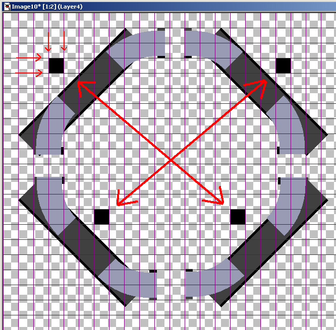 Important. Do not touch the graphic after you paste it on as a layer. Merge all layers and save using a new name. It should look something like this: ![]() The base roadRemember that? We need it again. ![]() Create a graphic the same height as your road (in this case 120 pixels) and about 600 pixels wide. Use the fill tool to fill the graphic with the base road image. Make a second copy. Rotate one of them forty-five degrees right and the other forty-five degrees left. Because each graphic begins as a perfect rectangle, the rotation gives a perfect forty-five degrees. However, aligning them with the corner sections will be the difficult part, so use the rectangle selection tool to outline one grid square and fill it with a color that contrasts with the background. For example: ![]() The master canvasWe need to create the forty-five degree template as a separate and distinct image. So, create a graphic approximately three times larger than the original, finished template. (eg, if the original template is 660x660, then make the forty-five degree template 1980x1980 pixels). Note. Keep using 60x60 proportions for ease of calculating. Paste the two forty-five degree road sections onto the master canvas two times each. Position them in a diamond shape in the upper left hand corner. Don't worry, you will have plenty of room to work, and you do not need to be perfect yet; an approximation is close enough for now. From the original, finished template we must now copy and paste each arc from each corner onto the master forty-five degree template. Important. You must include a part of the filler checker pattern with each arc to ensure proper alignment. Use the magic wand selection tool to highlight the road arcs. Notice the red lines restrict the selection to include just the arc. Hold the shift key to add part of the checker pattern. Like this: ![]() Copy the selection and paste as layer onto the master canvas. Then repeat for all eight arc sections. Move each arc into its approximate position over the forty-five degree roads. Make sure the arcs are above the roads. If they are not, you can use "bring to top" on the menu, or drag and drop the layers in the layer palette. You should now look something like this: ![]() Aligning the piecesFirst, make sure the squares we included with the forty-five degree road sections fit precisely within the grid view. This is crucial if road sections are going to line up regardless of the turn direction. ![]() Tip. Zoom in very close to ensure a proper fit. Next, fit the arcs so they first align with the grid view and then with the forty-five degree roads. The trick here is to always keep the checker portions we copied from the original template aligned with the grid view. Then just slide the arc along the grid view until the curved parts align with the forty-five degree road. ![]() Repeat for all eight arcs. Tip. For best results, make sure the upper two arcs are aligned on the same grid marks. Same goes for the bottom, left and right arcs. Opposing pairs (top-bottom, left-right) do not need to match each other (although you can do that if you want). The important thing here is that arcs on the same level match one another. Check listOn the forty-five degree roads, do all four guiding squares align with the grid view? On the arc sections, do all checker portions align with the grid view and do all arcs align with the forty-five degree roads? If you answer yes to both questions, then merge all layers. Crop overall canvasYou can now crop the image so it is a more reasonable size. Be careful to follow the grid view and keep the 60x60 proportions. ![]() Connecting the roadsPaste the base road as layers onto the master canvas several times and position the pieces to fill the gaps between the arc ends. Rotate the base road ninety degrees and paste as layers to close the gaps on the left and right portions. Note. This will not be a pefect fit. Don't worry if the base road overlaps itself. Just be sure the base road aligns with the grid view and with the arc ends. Note. When laying textures into your track be sure to include the full arc. The ends of some sections may resemble straights but they are not. Failing to recognize this quirk of the forty-five degree template has probably inhibited discovery of this easy method before now. ![]() Finishing touchesUse the magic wand selection tool (and the shift key) to select all road portions and fill them with a single color. Use Wint's checker base to fill the non-road areas. You should end up with something like this. ![]() SlicingObviously, the forty-five degree template is much larger than its ninety degree counterpart. However, when slicing, remember that most of it will be the base texture repeated across the entire surface. For a two-lane road such as demonstrated here, the number of textures generated should not exceed three hundred usable textures in total - for both templates combined. Note. It is possible to make a track using textures only from the forty-five degree template. In that case, you would just tighten up the texture arrangement to form a ninety degree corner that has a very minor straight part in it. Working this way, you could keep the texture count below two hundred in total. ConclusionsWhen you create the road textures, process the forty-five degree template in exactly the same way you process the ninety degree original. Doing so will provide seamless textures as well as forty-five degree roads that can branch off in all directions. ![]() Download the templates used in this tutorial here and here. |