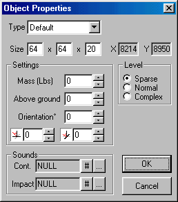 Once an object has been inserted into the terrain, quite a number of things can be done to alter the way it looks and behaves in the game.  These changes are made by setting Object Properties.  To open the Object Properties box simply double click on the object that you want to edit or adjust.  You may also open the Object Properties box by selecting the object with the mouse and then right clicking and selecting "properties" from the pop up menu.  Or you may select the object and press enter.  In either case, the default Object Properties box looks like this.