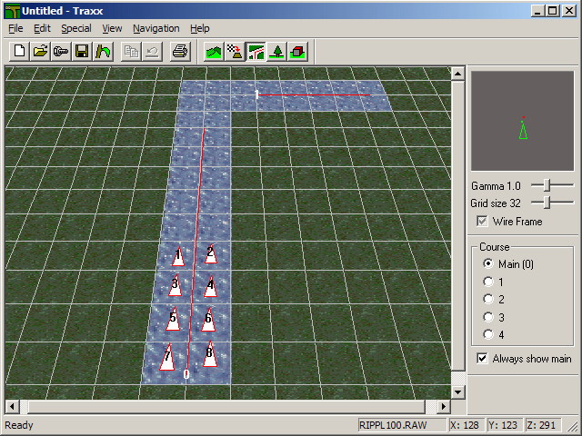 1. You can use Water Textures for your road and set the texture properties to water with an appropriate grip depth. If you animate the textures it can look acceptable. The good. This method is the least restrictive. Your road can travel over any altitude changes you want to give it. And, you can use the water textures in the startup.pod (RIPPL100.RAW to RIPPL800.RAW). You can also create your own (Salmon Run by mike204) or use the mtm1 water textures (Motor Boat Madness by 2Xtreme). The bad. Using a water texture gives the road a sharp-edged, artificial look. You might be able to compensate for this by using something like winterkill's templates, but if you animate the water you may find you have problems aligning the textures so they appear seamless. A second drawback is that the trucks lose a bit of tire grip. Note. This same technique is used to create flowing rivers, streams or water falls - such as you'll find in Proving Grounds by Sir James, SRT Mountain by World and Snowbound by Skyman.2. You can insert Ground Boxes above or below the road area, and the water will take on the properties of the ground box textures. That is, the water will inherit the texture properties of the ground boxes. For example, when a ground box texture is set to concrete and you drive through water underneath the ground box, the water will act like concrete rather than the usual water resistence. To see this above and below idea in action, download this Water Test Track (57k). The good. This method uses the game's real water. There is no attempt at artificial simulation of water because it's the real thing. The depth of the water is controled first by the water level itself, then by the terrain (lower means deeper water, higher means shallower). The bad. Straying away from the ground boxes causes the water to behave normally. So, you must make sure you cover every area in which you want the trucks to travel fast. Also, ground boxes above the water can look ugly. You can compensate for this by placing them beneath the road. However, when you travel under a ground box, you see the trailing water effects but when the ground box is below you no longer see this. Lastly, although the game permits thousands of ground boxes, the more you use the more lag you can get in the track (as well as glow-in-the-dark backdrops and have 'mark increase box count' errors).