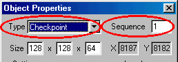 Again, in the properties box, set the type to check point and the sequence number to one.  And, again, the size may vary depending on the size of the summit you make.  Click OK.