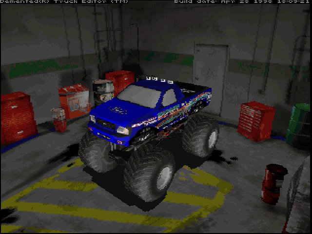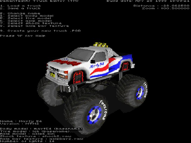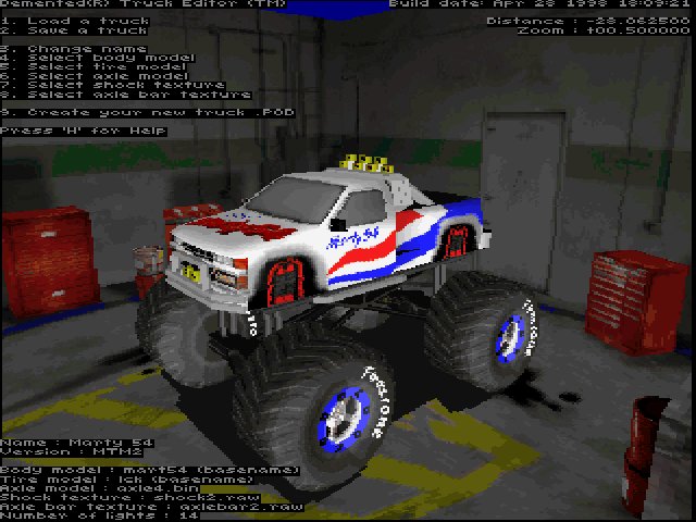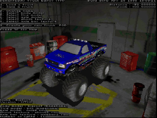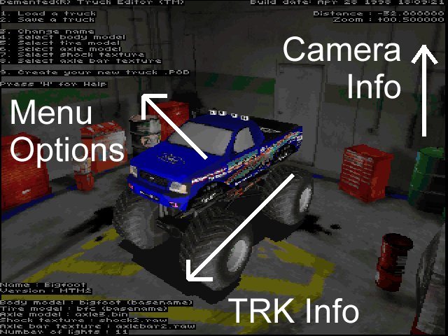 (Navigating) When Tracked2 starts, in addition to seeing Bigfoot rotate in the mtm garage, you also see a bunch of writing on the screen. This can be thought of in three parts. The uppper left part of the screen reviews the menu options, the lower left shows "some" information in the TRK file, and the upper right displays camera information (which is rarely needed). The menu options are the most important for creating your truck. They should be straight forward, but the following pages will explain the obvious things about how the options work as well as add some extra tips. You can press "H" on the keyboard at any time to list the commands that allow you to move around in the garage. For your convenience, you can click the bar below for a printable page of these commands. Keep it beside you until you can memorize the page.